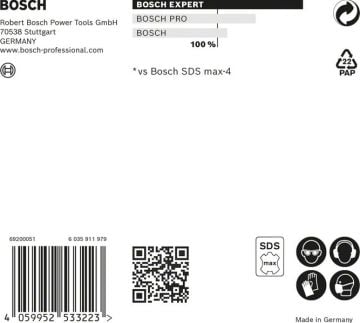 Bosch EXPERT SDS max-8X Kırıcı Delici Delme Ucu, düzenli olarak beton ve donatılı betonu delme işlemleri (ağır iş ankrajları veya betonarme demiri uzantıları gibi) gerçekleştiren inşaat çalışanlarına eşsiz performans, güvenilirlik ve kullanım ömrü sunar. SDS max kırıcı matkaplara yönelik EXPERT aksesuarıdır.