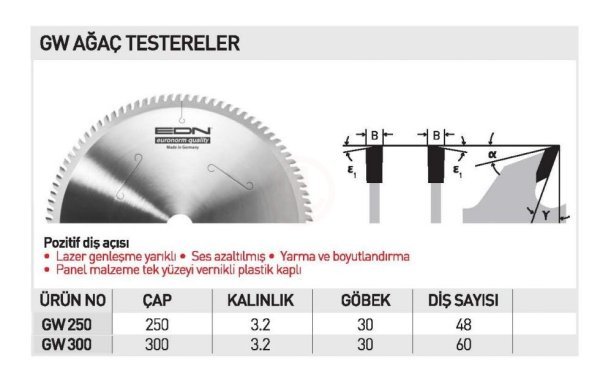 Edn Marka EDNGW30060 Kodlu Edn GW 300 AĞAÇ TESTERE 300 MM 60 DİŞ - EDNGW30060 ürünü Al Nalburiye güvencesiyle vade farksız 6 taksit imkanıyla satın alabilirsiniz.